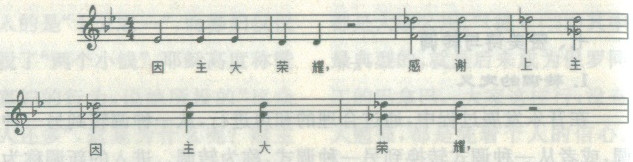 一首赞美诗没有改变调号,只是改变了调式和主音,这也是转调的方式。由于在乐谱上没有标明转调的调号,这种转调方式比较隐形,很容易让人觉得没有转调。但诗班指挥如果对转调方式比较了解,就会在分析乐谱时看出转调。比如《去,宣传主的福音》(黑人灵歌),调号是降B,主音是降B,但在转调过程中,调号没有改变,还是降B,只改变了调式和主音,就是从降B调转到F调,主音降B变成主音F,即最后一音(主音)是F。谱例片段如下: