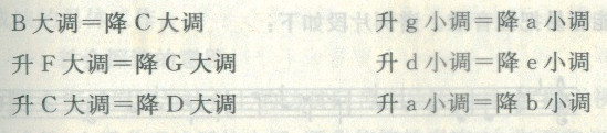 两个调中所有的音级都是等音关系,而且具有同样的调式意义,称为等音调式。如#F大调与bG大调,#d小调与be小调,虽然调号与音名不同,但在键盘上的位置却是完全相同。在七个升降号各调中,大调与小调各有三对等音调。如下: